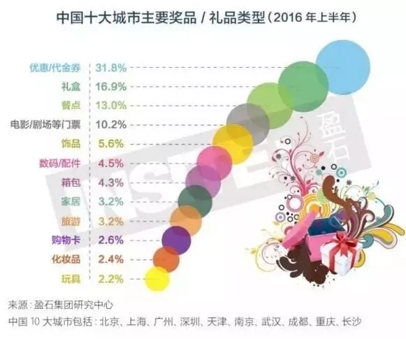 根据盈石集团研究中心追踪的数据显示,推广活动中所涉及的礼品或奖品总共涉及12大类,其中以优惠/代金券较为流行,占比达到31.8%。而餐点礼品的形式受到越来越多购物中心的青睐,增速最快,同比增幅上升了3个百分点。购物中心越来越注重不同业态之间的联动,特别是娱乐业态与餐饮业态互动,如武汉汉街万达推出凭餐饮消费小票满额即可获赠电影票一张等活动。不同业态之间的联动,可以将消费者在购物中心逗留时间延长,也能让热门业态带动冷门业态,实现购物中心整体销售额水平的提升。