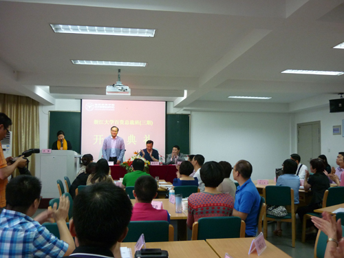 浙江大学百货总裁班,2012年6月5日在浙江大学华家池校区开学。浙江大学继续教育学院郭常平院长、继教学院经济管理培训中心叶祺仁主任、台湾知名商业专家郑玮庆老师在开学典礼上做了致词,欢迎同学们到浙江大学学习。