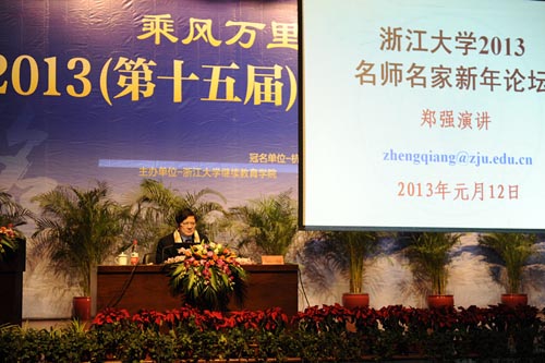 2013年1月12日,“乘风万里,任泽浙商”2013年浙江大学第十五届名师名家新年论坛在浙江大学紫金港拉开序幕。本次新年论坛是继2012年十八大会议胜利召开之后的浙江大学经典总裁学子们齐聚一堂,与名师名家们一起对过去、现在和未来进行思考和交流的一次盛会。