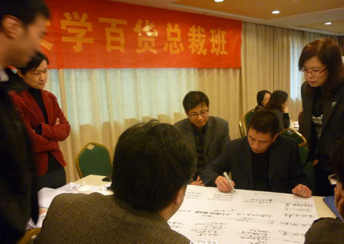 2010年11月25-30日,浙江大学百货总裁班在杭州举办了百货、购物中心块面的专业培训课程。课程内容包含了百货、购物中心商圈经营、客源开发与维护、百货公司年度经营计划制定、百货公司预算编制等专业内容。总裁班学员们,进行了分组探讨和竞赛,通过实战演练收获满满。